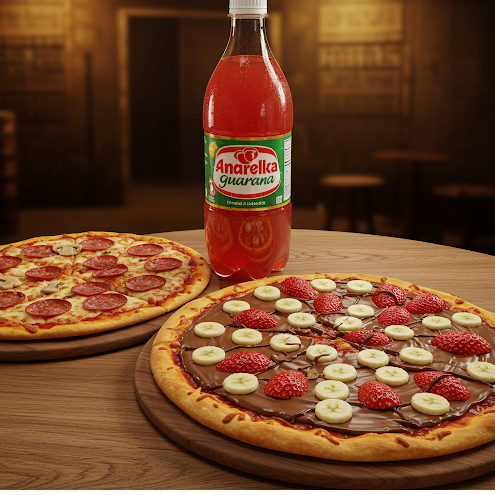 1 Pizza 1/2 Calabresa Acebolada ,Massa artesanal ,Molho de Tomate italiano,Muçarela,Calabresa e Cebola,Oregano 1/2 Muçarela,Massa artesanal ,Molho de Tomate italiano,Muçarela,Oregano (8 Pedaços)+Broto Banana Nevada + Refri Gratis